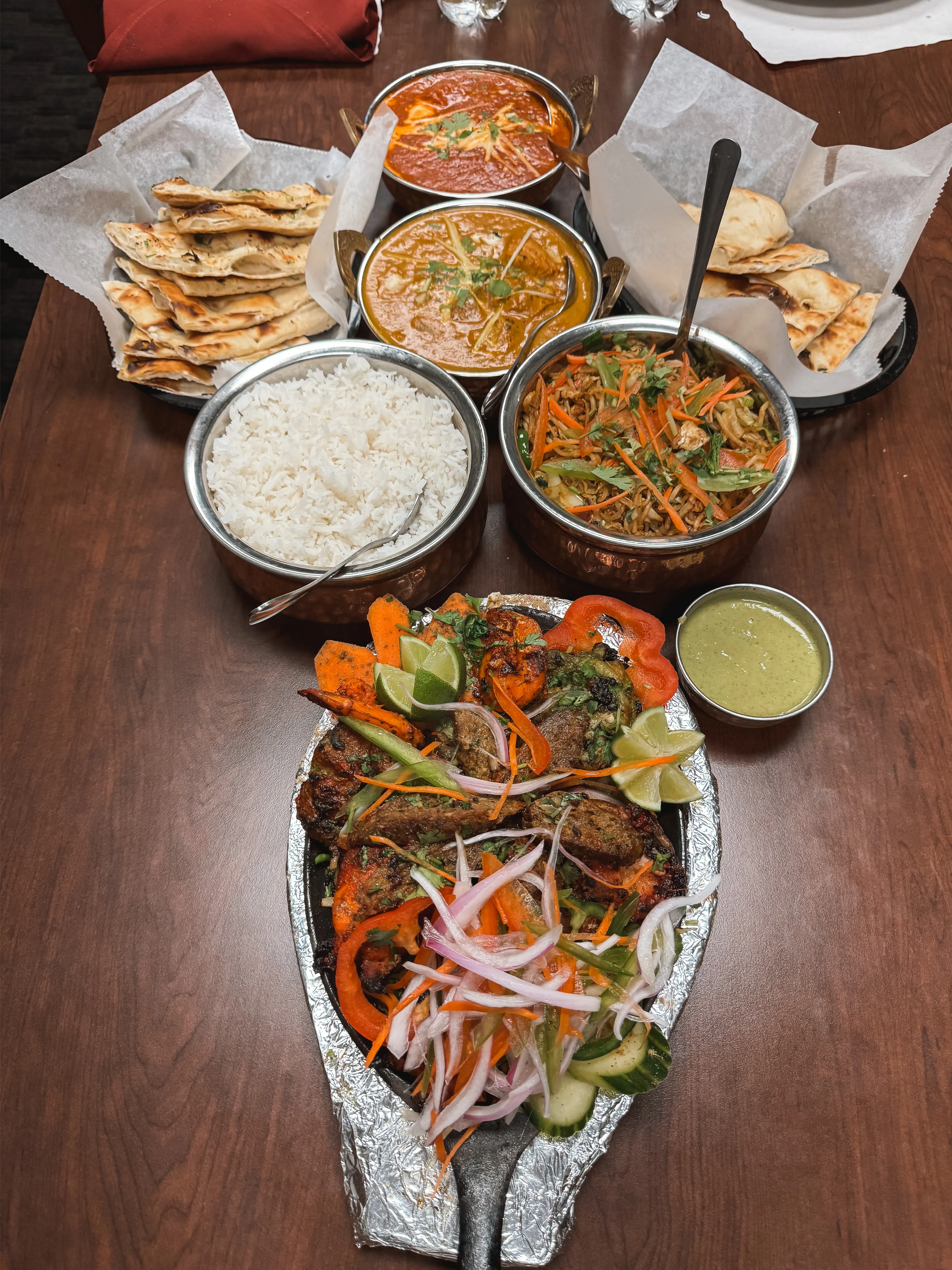 Wir begannen unser Mahl mit köstlichen Samosas, die ein voller Erfolg waren. Midi konnte gar nicht genug vom cremigen Chicken Tikka Masala und dem zarten Butter Chicken bekommen – er füllte seinen Teller gleich dreimal! Das Butter Naan und Knoblauch Naan waren die perfekte Begleitung zu diesen Hauptgerichten. Er aß so viel, dass er gefühlt für die ganze Woche satt war. Chris genoss das aromatische Biryani, verschiedene Currys und ebenfalls reichlich Naan. Es weckte bei ihm Erinnerungen an seine Indienreise zum Holi-Fest 2020, kurz bevor die Grenzen geschlossen wurden. Auch unser wählerischer Esser Ollie war begeistert von seinen Egg Hakka Noodles, was eine angenehme Überraschung war.