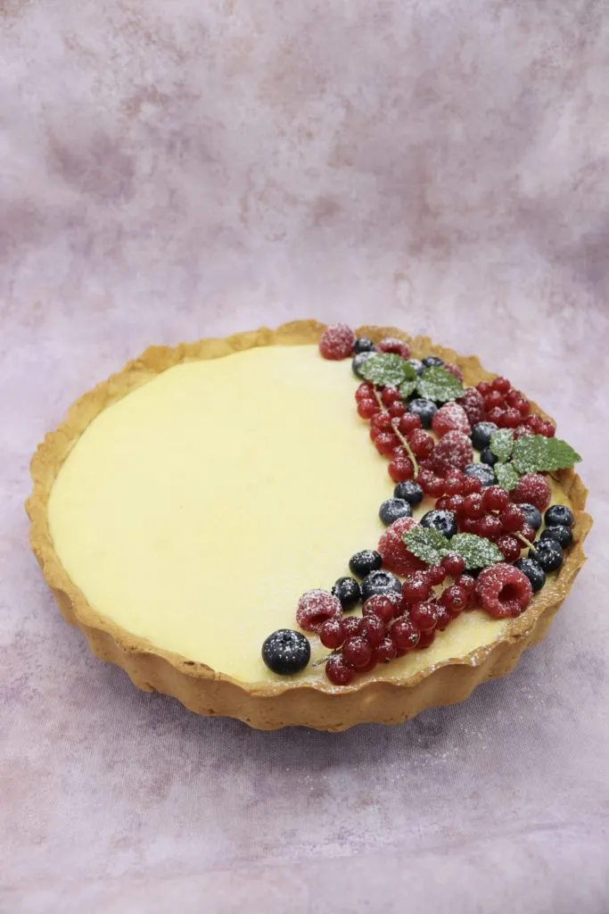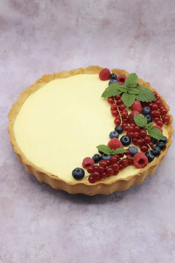 Während der Boden blind backt, bereiten Sie die cremige Käse-Sahne-Masse vor, indem Sie alle Zutaten gründlich miteinander verrühren. Nehmen Sie den vorgebackenen Boden aus dem Ofen, lassen Sie ihn kurz abkühlen und füllen Sie ihn dann mit der Käse-Sahne-Masse. Backen Sie die Tarte weitere 25-30 Minuten. Achten Sie auf die Farbe, um eine zu starke Bräunung zu vermeiden; notfalls die Temperatur reduzieren oder den Kuchen mit Alufolie abdecken.