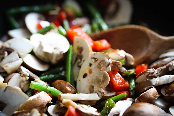 2 EL Olivenöl in einer Pfanne erhitzen und zuerst die grünen Bohnen darin etwa 2-3 Minuten scharf anbraten. Paprikastücke sowie Zwiebel- und Knoblauchwürfel hinzugeben. Die Hitze reduzieren und die Zutaten weitere 2-3 Minuten anbraten. Dann die Champignons dazugeben und nochmals kurz weiterbraten. Die Zutaten mit Agavendicksaft karamellisieren lassen und mit Salz, Paprikapulver und Chiliflocken würzen.