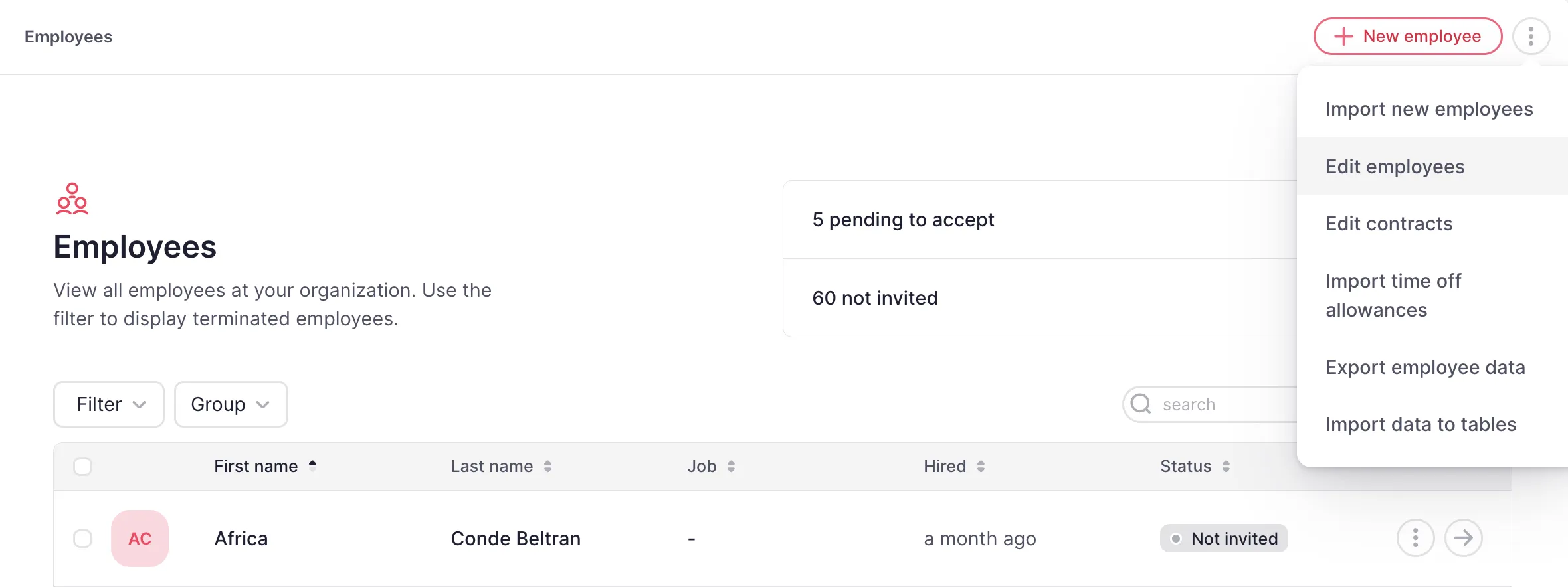 Navigieren Sie zur Mitarbeiterübersicht, wählen Sie die Option “Mitarbeiter bearbeiten”, laden Sie die Vorlage herunter und tragen Sie in der Spalte “DATEV-Mitarbeitercode” den entsprechenden Code für jeden bestehenden Mitarbeiter ein. Importieren Sie die ausgefüllte Datei zurück. Die Mitarbeiter erhalten dann in ihren persönlichen Daten den DATEV-Mitarbeitercode, was eine eindeutige Identifizierung in beiden Systemen sicherstellt.