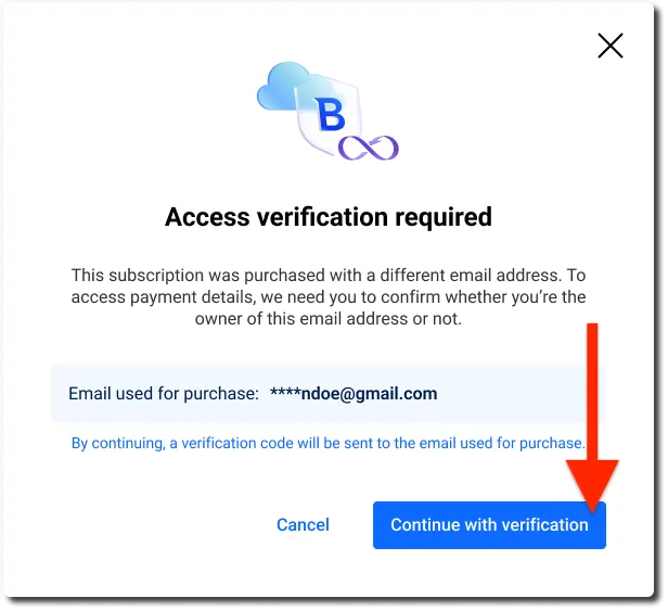 - ⓘ Wenn die E-Mail, mit der Sie Bitdefender gekauft haben, nicht mit Ihrem Bitdefender Central-Konto übereinstimmt, wird ein Verifizierungscode an die Kauf-E-Mail gesendet. Klicken Sie zur Fortsetzung auf „Mit Verifizierung fortfahren“, geben Sie den Code aus der Kauf-E-Mail ein und klicken Sie auf „Code bestätigen“, dann klicken Sie auf „Zahlungsdetails anzeigen“.