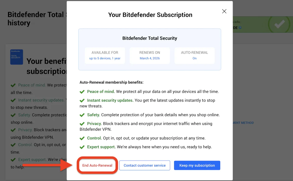 Jederzeitige Abmeldung: Sie können Ihren automatischen Verlängerungsdienst jederzeit kündigen. Nach der Kündigung müssen Sie Ihr Bitdefender-Produkt manuell verlängern. Dies gibt Ihnen die volle Flexibilität, Ihre Abonnements nach Ihren Bedürfnissen zu verwalten.