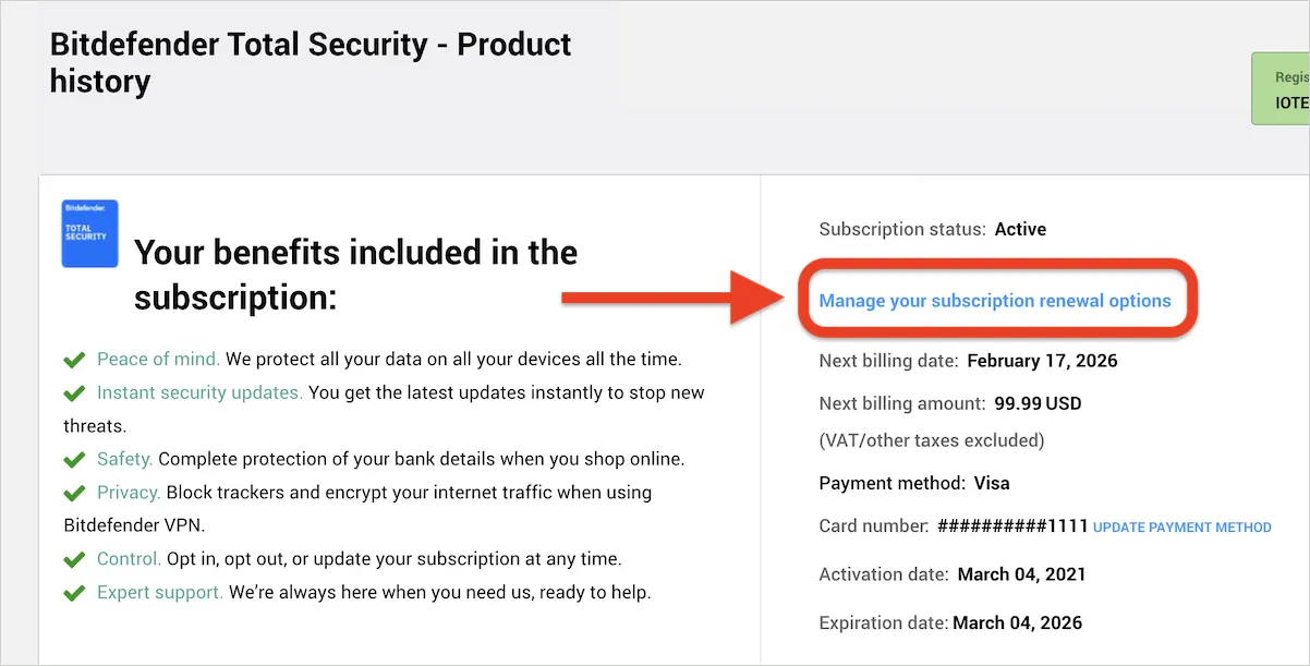 - Wenn Ihr Bitdefender-Abonnement nicht auf automatische Verlängerung eingestellt ist, sehen Sie anstelle von „Verwaltung Ihrer Abonnement-Verlängerungsoptionen“ die Option Abonnement reaktivieren. Klicken Sie darauf, wenn Sie die automatische Verlängerung aktivieren möchten.