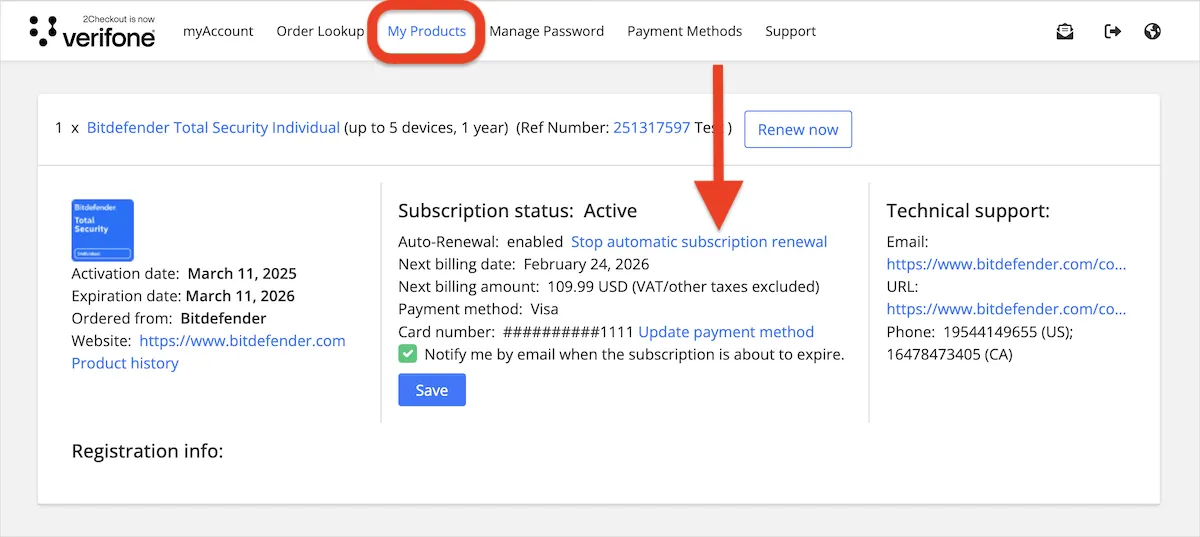 Sollten Sie die automatische Verlängerung nicht über den „Meine Zahlungen“-Tab in Bitdefender Central stoppen können, haben Sie die Möglichkeit, dies über 2Checkout (Verifone) zu tun: