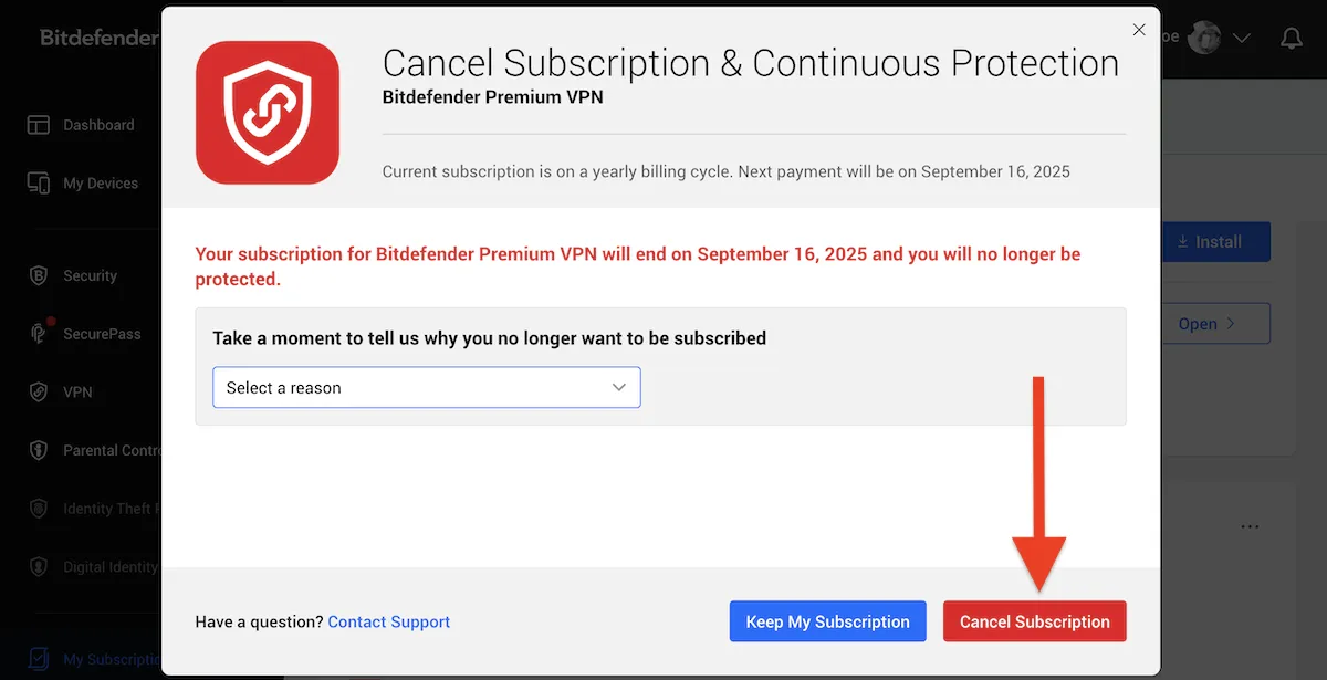 - Sofort kündigen (nur 30 Tage nach dem Kauf verfügbar): Wenn Sie diese Option wählen, erhalten Sie eine Rückerstattung, die automatische Verlängerung wird deaktiviert und Ihr Bitdefender-Abonnement läuft sofort ab.