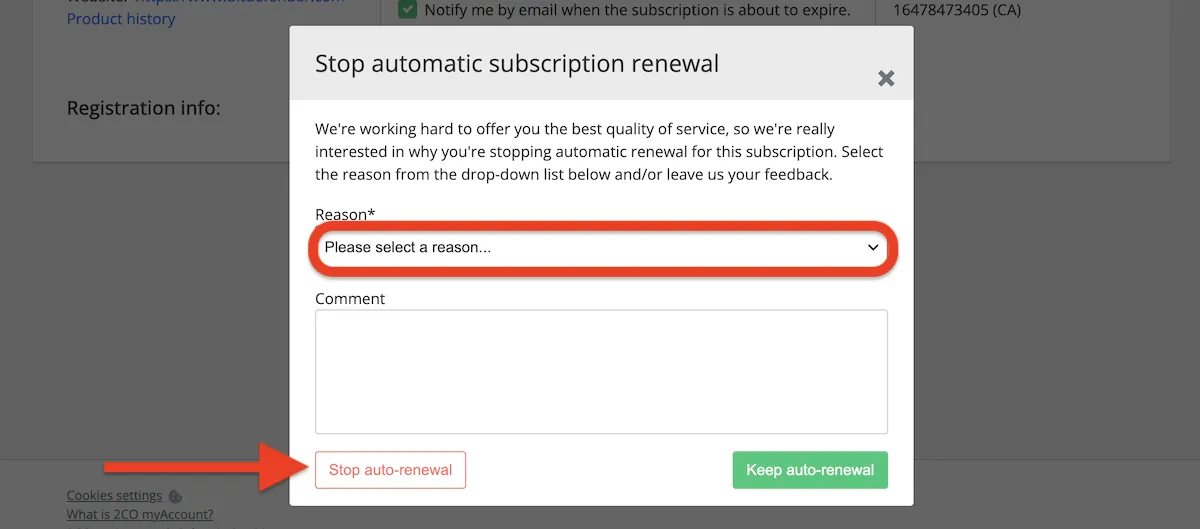 Wählen Sie einen Grund für das Stoppen der automatischen Verlängerung und klicken Sie dann zweimal auf Automatische Verlängerung stoppen.