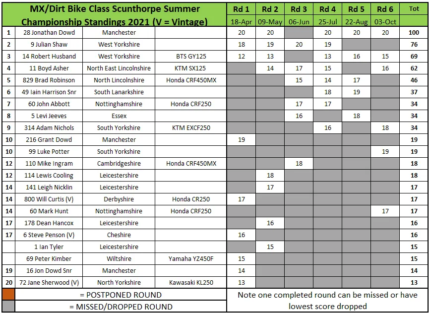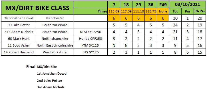 In der MX-Klasse setzte Jonathan Dowd seine Dominanz fort, holte sich die maximale Punktzahl, das Finale und den Titel. Luke Potter wurde Zweiter im Finale, Adam Nichols Dritter.