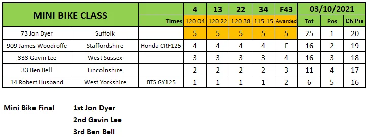 Jon Dyer ratterte in den Minibikes fünf Vorlaufsiege herunter und verbuchte einen weiteren im Finale vor dem späteren Champion Gavin Lee und Ben Bell. Der Titel ging jedoch an James Woodruffe, der eine fantastische Saison hatte.