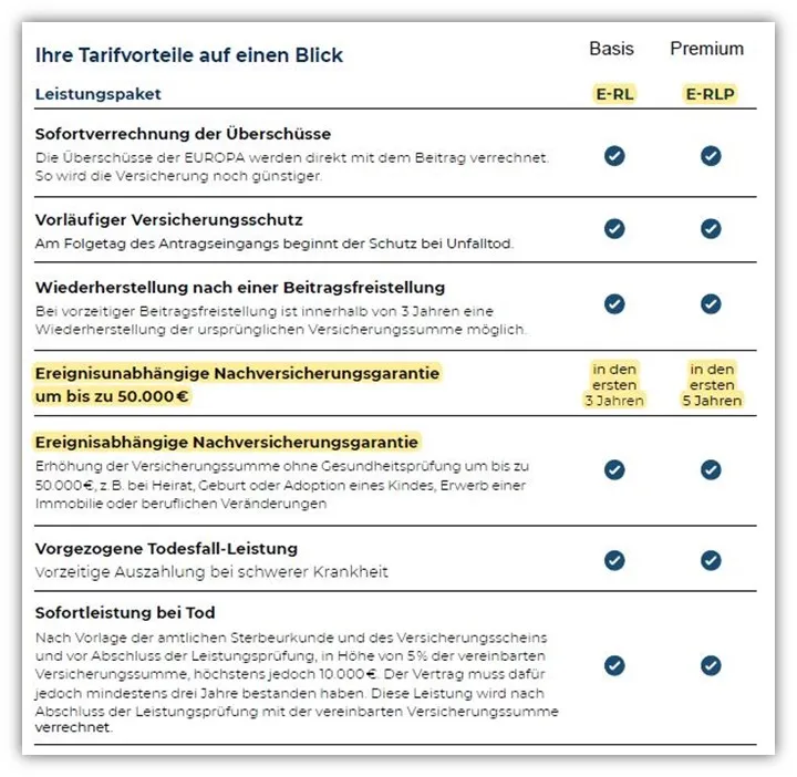 Leistungsumfang: Europa Risikolebensversicherung Basis-Schutz und Premium-Schutz.