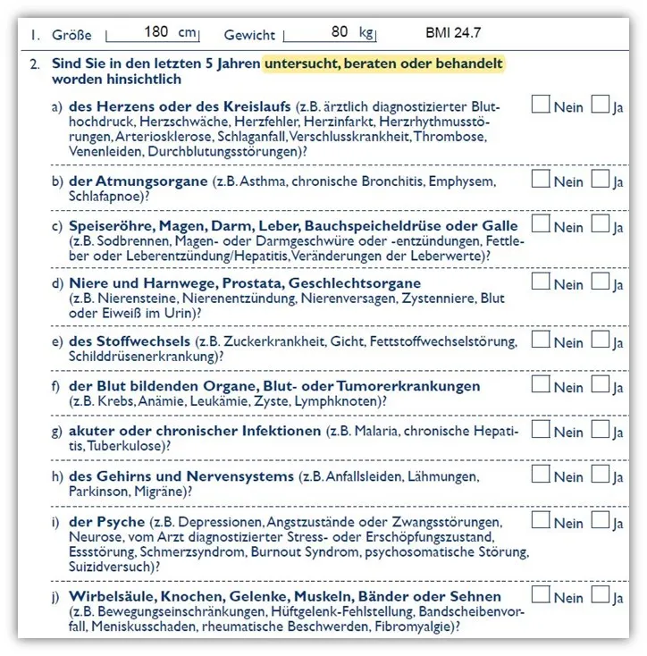 Hier sind nicht nur Informationen über deinen eigenen Gesundheitszustand erforderlich, sondern auch über den deiner Eltern oder Geschwister. Für uns, die besonderen Wert auf die Qualität der Gesundheitsfragen legen, stellt dies eine Fragestellung dar, die erhebliche Fallstricke birgt.
