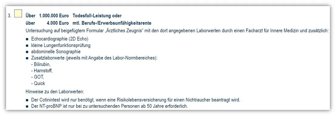 Ab einer Versicherungssumme von 1.000.000 € sind neben den beschriebenen Untersuchungen zusätzlich noch folgende Untersuchungen notwendig: