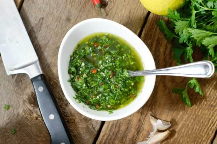 Chimichurri – Mischen Sie 1 Tasse gehackte frische Petersilie, 2 gehackte Knoblauchzehen, 1 kleine Chili, 1 Zitronensaft mit 1 Tasse Olivenöl. Das vollständige Rezept finden Sie hier.