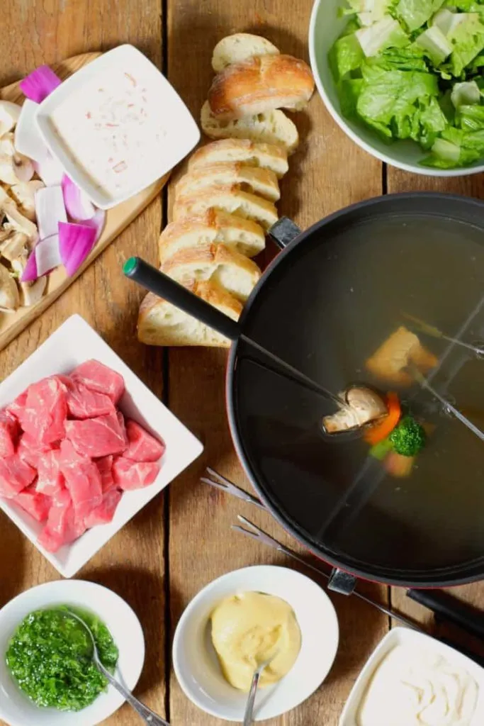 Fleischfondue auf Brühebasis ist genauso lecker wie die Variante auf Ölbasis und kann sogar aromatisiert werden, um den Speisen mehr Geschmack zu verleihen. Kräuter, Gewürze und sogar Wein können der Brühe zugesetzt werden, um das Fondue mit Geschmack anzureichern. Selbstgemachte Hühner-, Rinder- oder Gemüsebrühe ist am besten, aber im Notfall kann auch eine gekaufte Brühe verwendet werden.