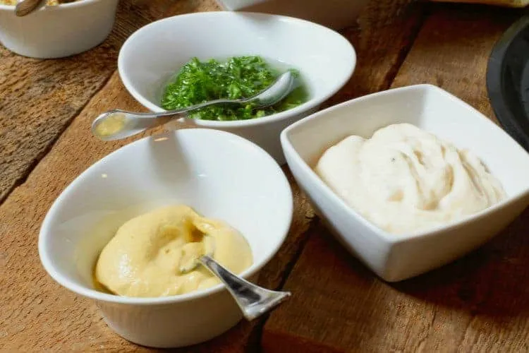 Knoblauch-Aioli – Mischen Sie 1 Tasse Mayonnaise mit 3 gehackten Knoblauchzehen, einem Spritzer Zitrone, frisch gemahlenem Pfeffer und 1 Teelöffel Dijon-Senf.