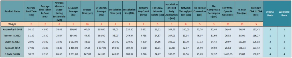 Hier ist jedenfalls, wie der Test durchgeführt wurde. Jedes Produkt wird anhand von 17 Leistungsparametern gemessen (Startzeit, Internet Explorer-Startzeit, Dateiöffnungs- und Kopierzeit usw.). Dann werden die Produkte nach ihren erzielten Punktzahlen in jedem Test eingestuft, und dann werden die Ranglisten summiert, und wer die höchsten Noten erhält, gewinnt.