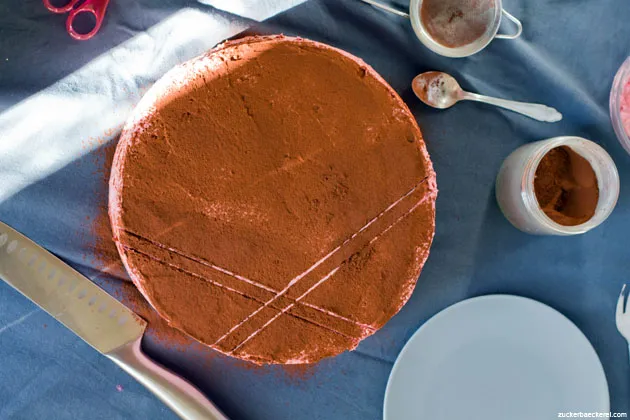 - Kurz vor dem Servieren vier Wollfäden auf der Kuchenoberfläche arrangieren und diese großzügig mit Kakaopulver bestäuben.