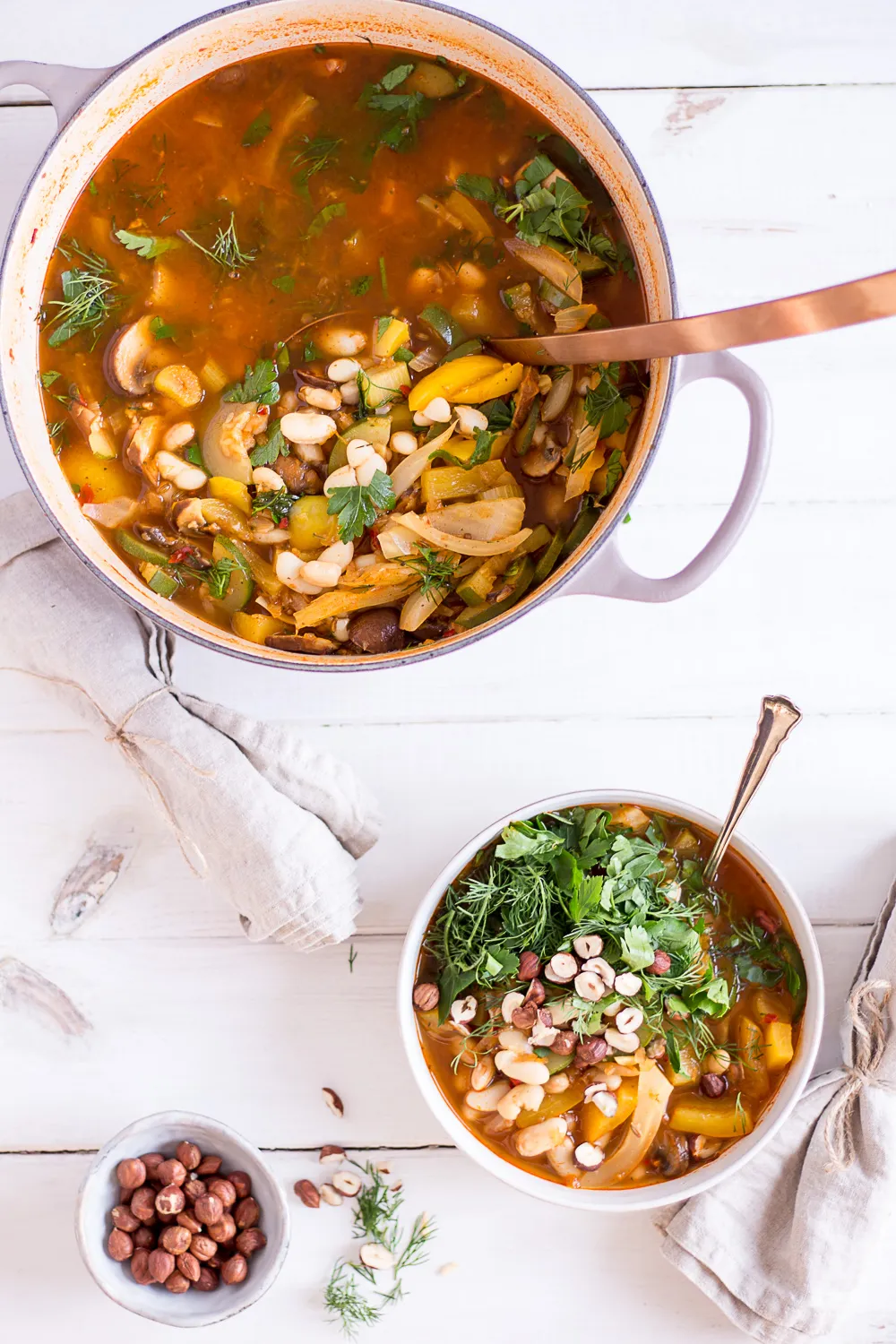 Bohnen, Linsen und frisches oder tiefgekühltes Gemüse – mehr braucht ein guter Eintopf oft nicht. Selbst Kräuter können aus dem Gefrierschrank stammen. Dieser Eintopf mit seiner Tomatenbrühe bietet eine willkommene Abwechslung zu currylastigen Varianten und ist ein hervorragendes Beispiel für gerichte zum vorkochen, die auch mit wenigen Zutaten auskommen.