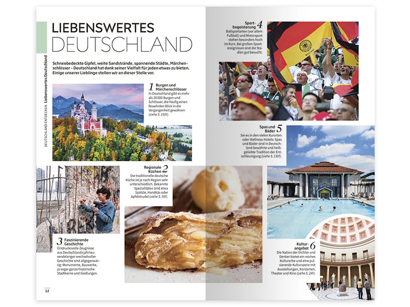 Die deutsche Küche ist reichhaltig und regional sehr unterschiedlich. Probieren Sie in Bayern unbedingt Weißwurst und Leberkäse, im Rheinland einen deftigen Sauerbraten, in Hamburg Franzbrötchen und an der Küste frischen Fisch. Dazu passt ein kühles deutsches Bier oder ein regionaler Wein.