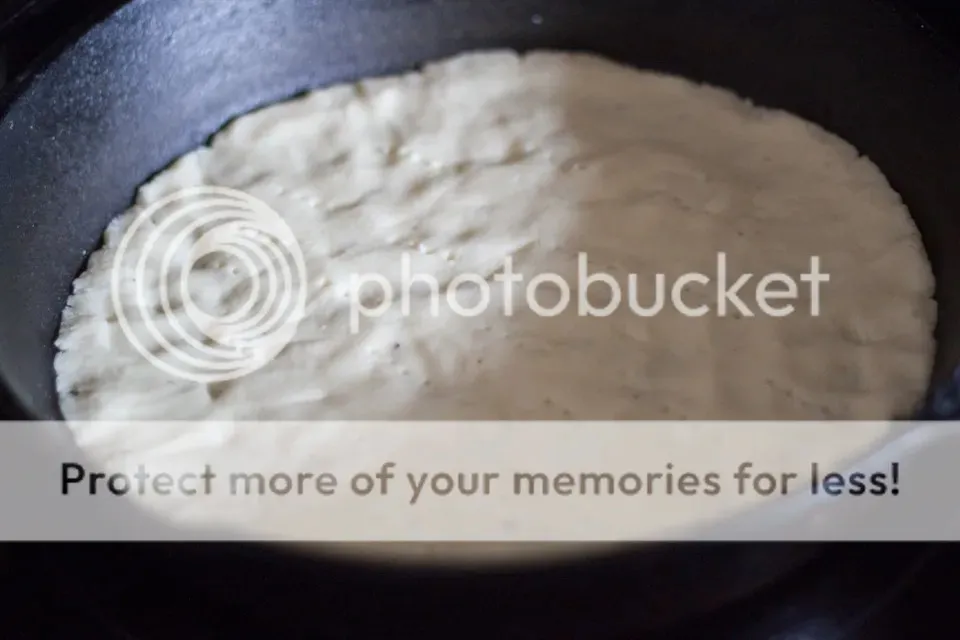 Legen Sie den Teig in eine Gusseisenpfanne und drücken Sie ihn mit den Fingern bis an die Ränder der Pfanne. Versuchen Sie, ihn so dünn wie möglich zu bekommen – dies ist wichtig, damit der Boden nicht zu zäh wird. Stechen Sie mit einer Gabel einige Löcher in den Teig, damit Luft entweichen kann.