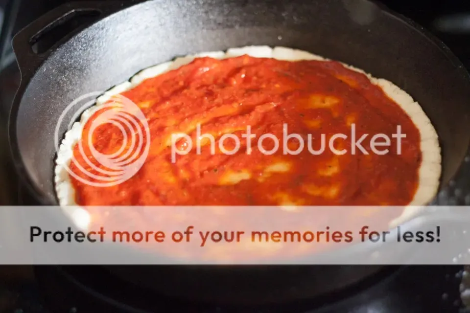 - Verteilen Sie ¼ Tasse Sauce auf dem vorgebackenen Boden.