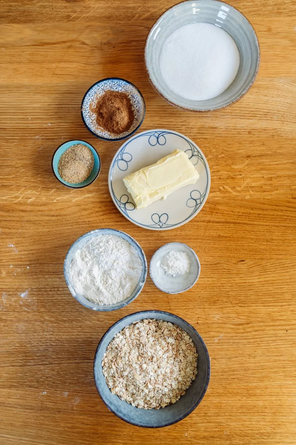 - Teig vorbereiten: Mehl, Haferflocken, Zimt, Zucker, Vanillezucker, Salz und Backpulver in einer Schüssel vermischen. Ein Ei und die weiche Butter hinzufügen. Alles zu einem homogenen Teig verrühren.