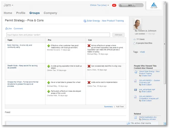 SAP Jam vereint Menschen, Informationen, Anwendungen und Prozesse über Ihr erweitertes Geschäftsnetzwerk von Kunden, Partnern und Mitarbeitern hinweg. Finden Sie schnell Experten, indem Sie mühelos Personen identifizieren, die Ihnen bei der Lösung von Problemen helfen oder bewährte Verfahren vermitteln können. Lernen Sie aus früheren Arbeiten, indem Sie alle Gespräche, Dokumente, Rückmeldungen und Entscheidungen für spätere Referenzzwecke oder zur Wiederverwendung speichern.
