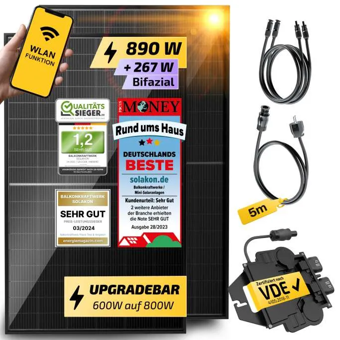 | Lieferumfang | 1x Bifaziales Solarmodul mit 430 Wp;1x Wechselrichter;1x Schukokabel (5m) zum direkten Anschluss an der Steckdose;2x Haken zur Montage am Balkongeländer. | 2x Bifaziale Solarmodule mit je 445 Wp;1x Wechselrichter;1x Schukokabel (5m) zum direkten Anschluss an der Steckdose. |