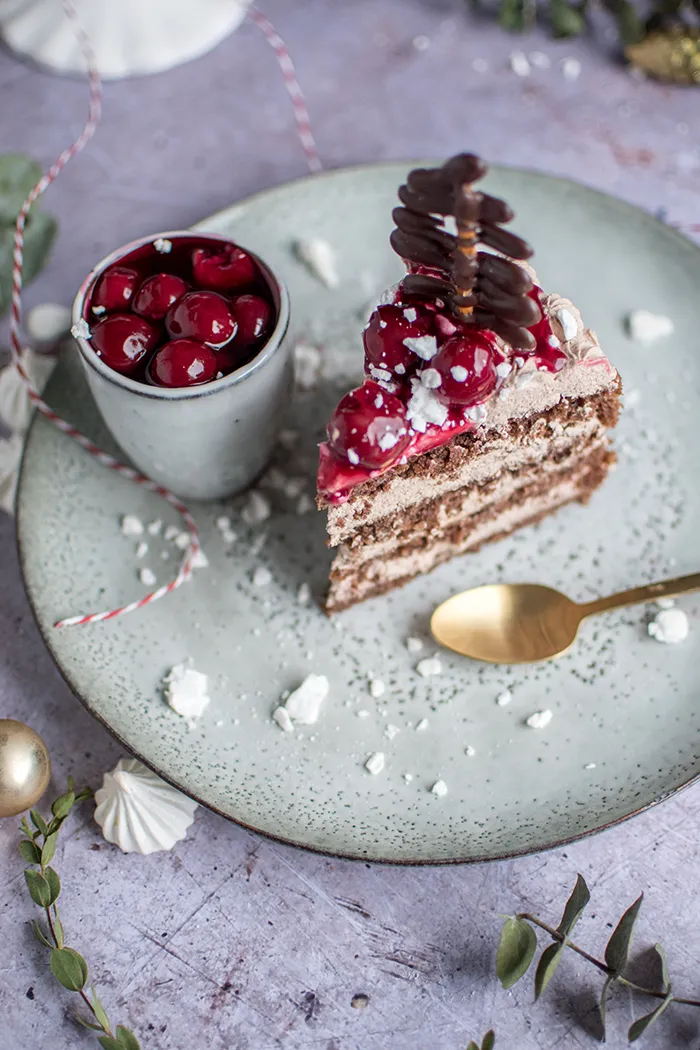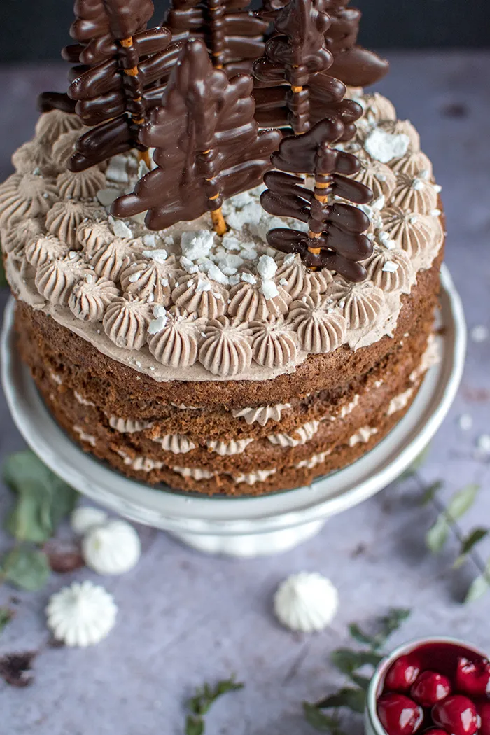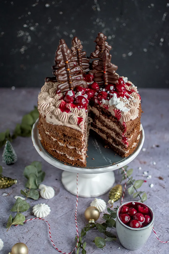 - Servieren: Erst kurz vor dem Servieren die Glühweinkirschen auf der Torte verteilen und die vorbereiteten Schokoladen-Tannenbäume mit dem Salzstangen-Stiel in die Torte stecken.