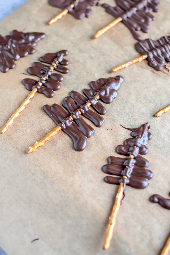 Schokoladen-Tannenbäume aus Salzstangen und geschmolzener Kuvertüre