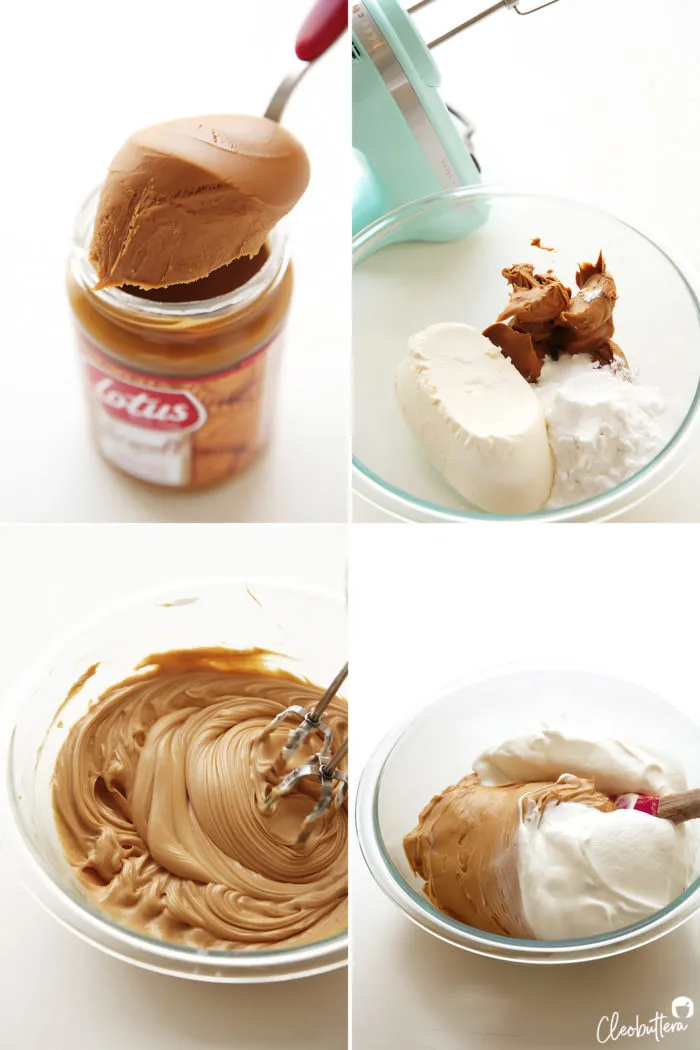 Eine Schritt-für-Schritt-Anleitung in Bildern für die Zubereitung der cremigen Lotus Käsekuchenfüllung.