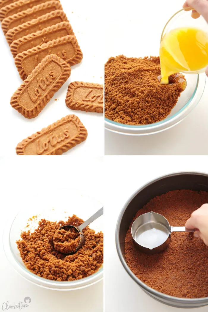 Eine Collage, die die Schritte zur Herstellung des knusprigen Lotus Keksbodens visualisiert, von den ganzen Keksen bis zum fertigen Boden.