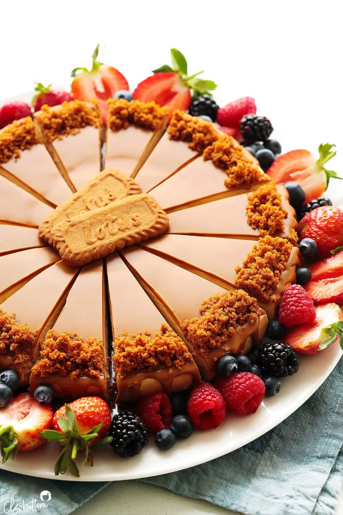- Stellen Sie den Kuchen noch einmal in den Kühlschrank, um das Topping fest werden zu lassen; mindestens 10 Minuten. Bestreuen Sie die Seiten des Kuchens mit der beiseitegelegten Keks-Krümelmischung. Stellen Sie die restlichen 2 Lotus-Kekse dekorativ obenauf. Garnieren Sie die Platte nach Belieben mit Beeren.