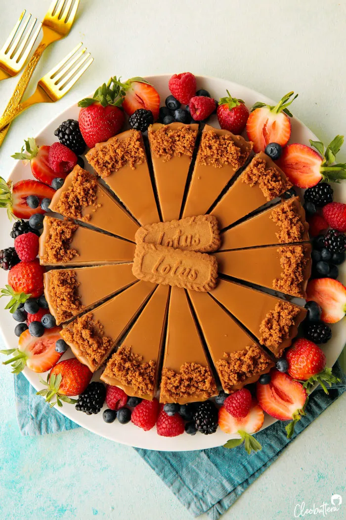 - Den Käsekuchen erneut in den Kühlschrank stellen, damit das Topping fest wird; mindestens 10 Minuten. Die Seiten des Kuchens mit der beiseitegelegten Keks-Krümelmischung bestreuen. Für saubere Scheiben tauchen Sie ein scharfes Messer in heißes Wasser, wischen es trocken und schneiden dann. Wiederholen Sie dies, indem Sie das Messer zwischen jedem Schnitt sauber wischen. Platzieren Sie die restlichen 2 Lotus-Kekse dekorativ obenauf. Garnieren Sie die Platte nach Belieben mit Beeren.
