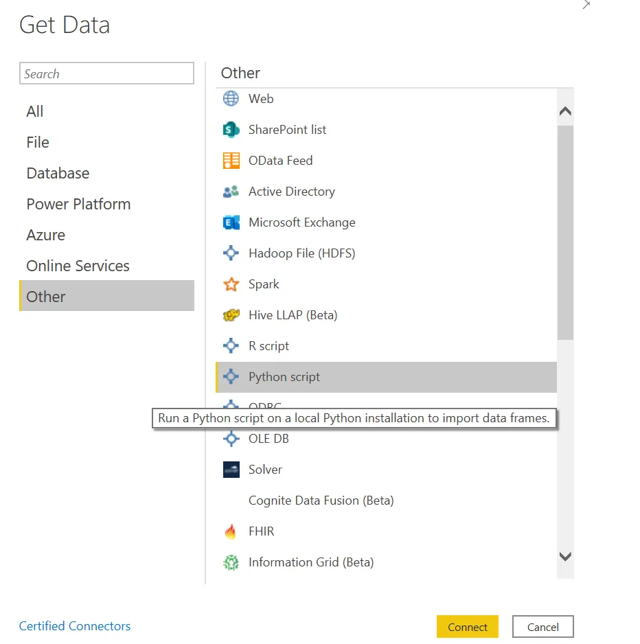a. Wählen Sie in Power BI Get Data > Other > Python Script > Connect.