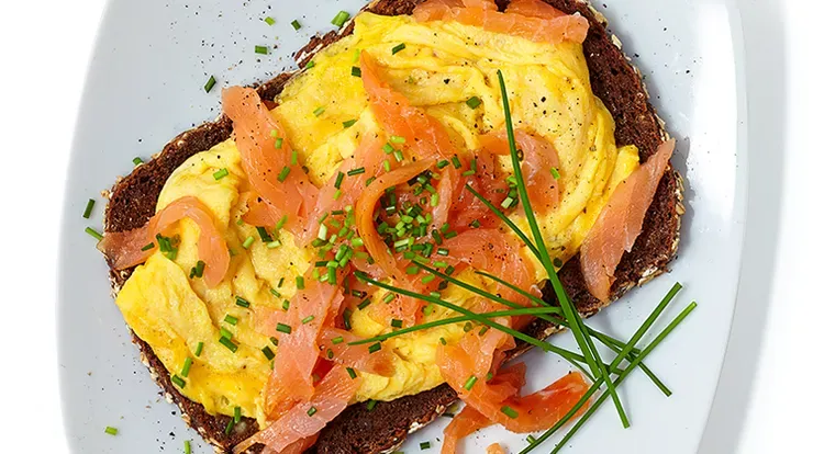 Räucherlachs-Rührei mit Schnittlauch und Vollkornbrot