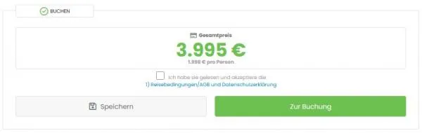 Hier haben Sie nochmals die Möglichkeit, Ihre Reise anzupassen oder weitere Leistungen hinzuzufügen. Anschließend können Sie Ihre Reise speichern oder direkt buchen.