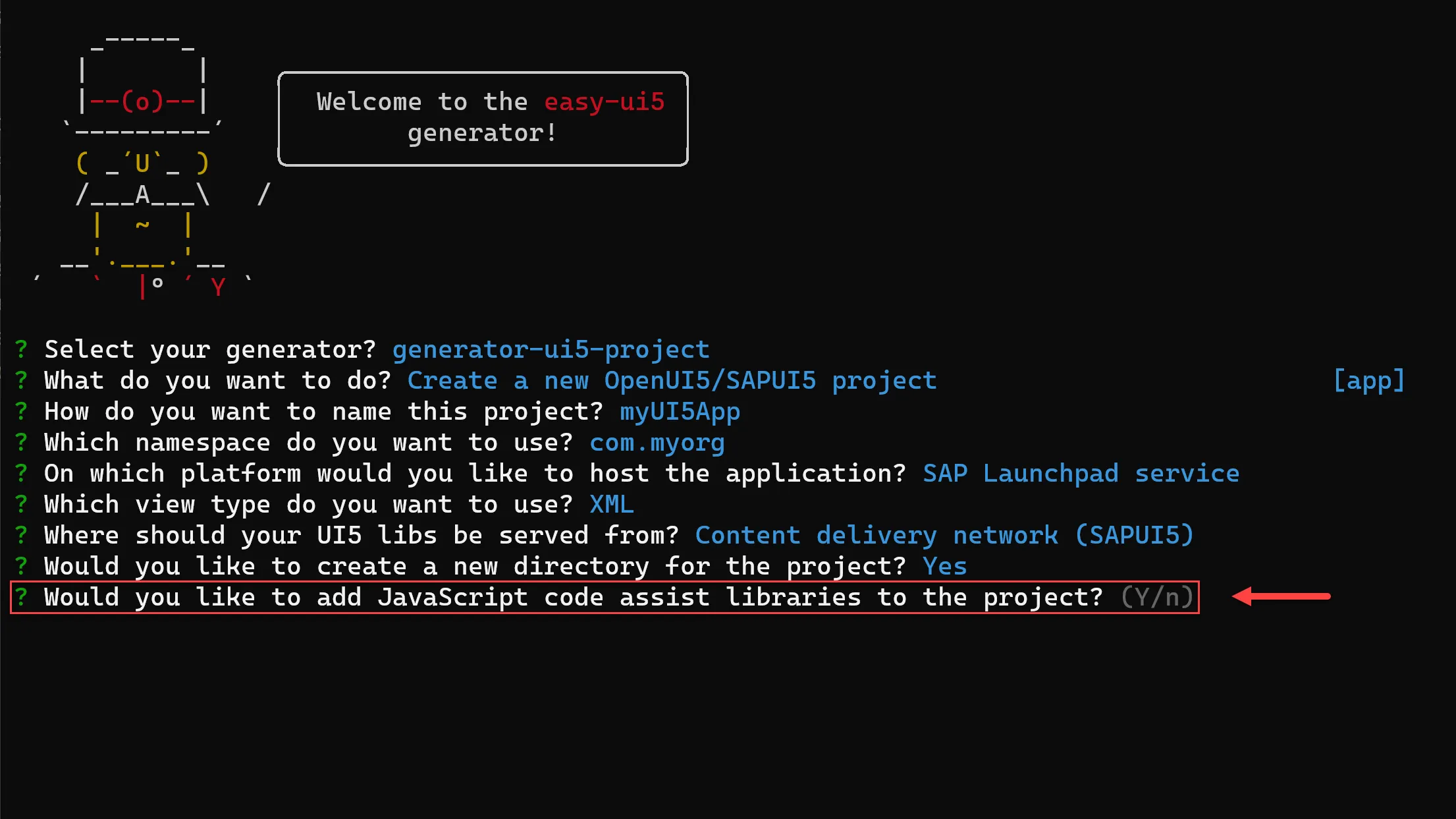 Der Easy-Ui5 Generator ermöglicht das Erstellen neuer Projekte, das Hinzufügen von Models, Views und vielem mehr. Auch hier können Sie bei der Projekterstellung die Option zur Hinzufügung der JavaScript-Code-Assistenz auswählen, was die manuelle Konfiguration erspart.