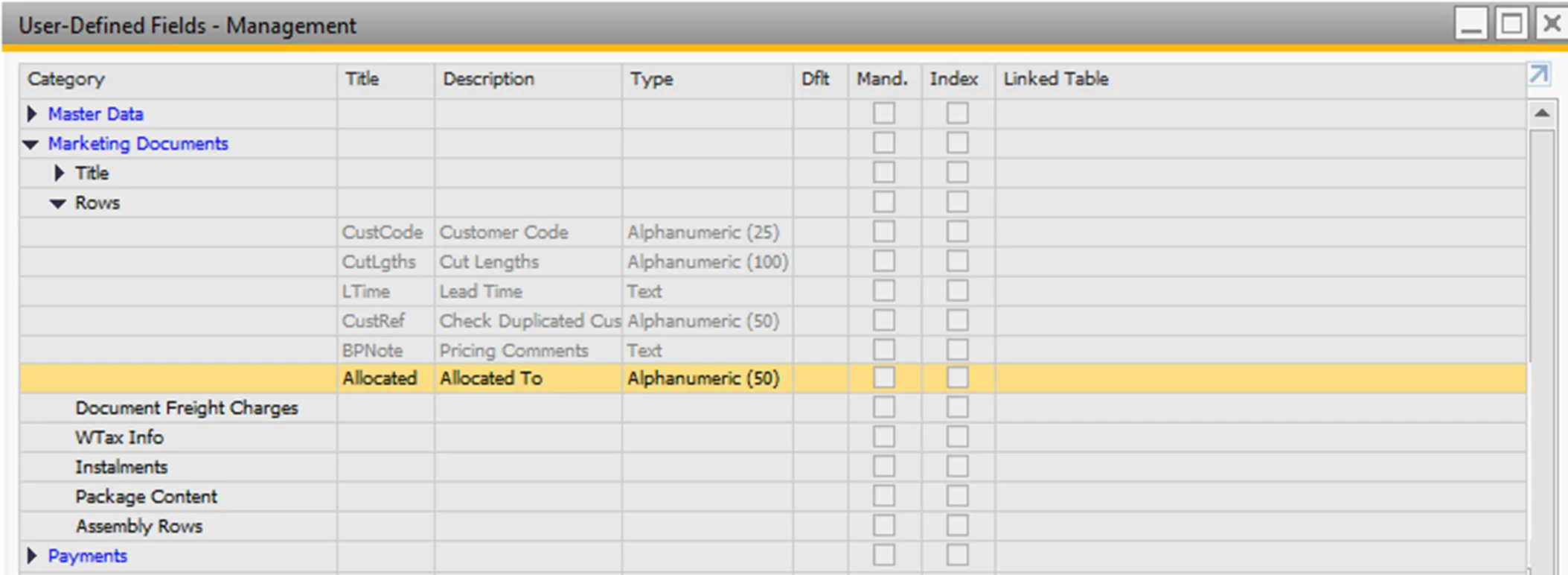 Alt: Benutzerdefiniertes Feld (UDF) integriert in die Zeilen eines Marketingbelegs in SAP Business One