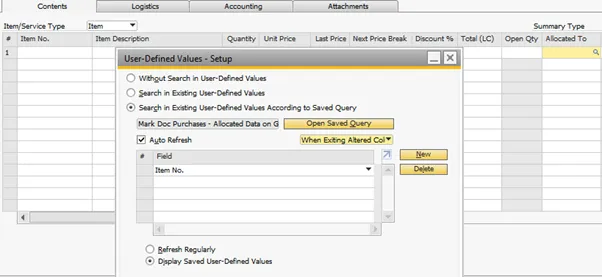 SELECT T0.[U_Allocated] FROM OITM T0 WHERE T0.[ItemCode] = $[$38.1.0] Diese Informationen werden dann der Bestellung hinzugefügt, die sich auf den hinzugefügten Artikel bezieht. Bei Bedarf können diese Daten auf der Bestellung überschrieben werden, was dann auf den Wareneingang (GRPO) übertragen wird.