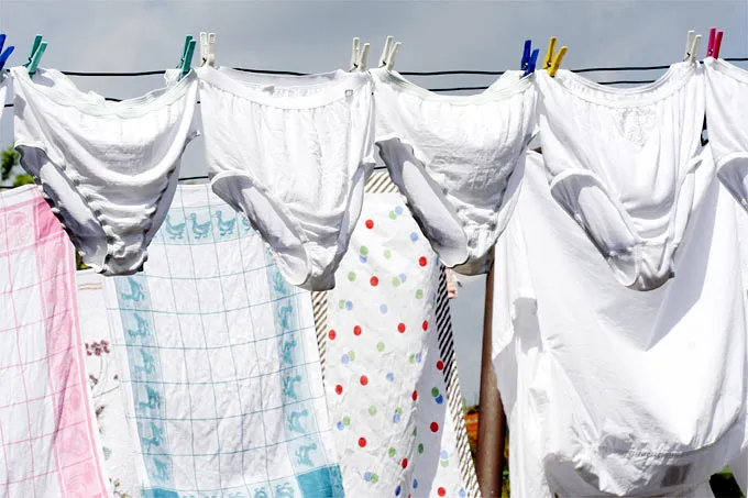 Alt-Text: Wäscheleine mit trocknender Wäsche, symbolisiert umweltfreundliches Trocknen und Wassersparen im Haushalt