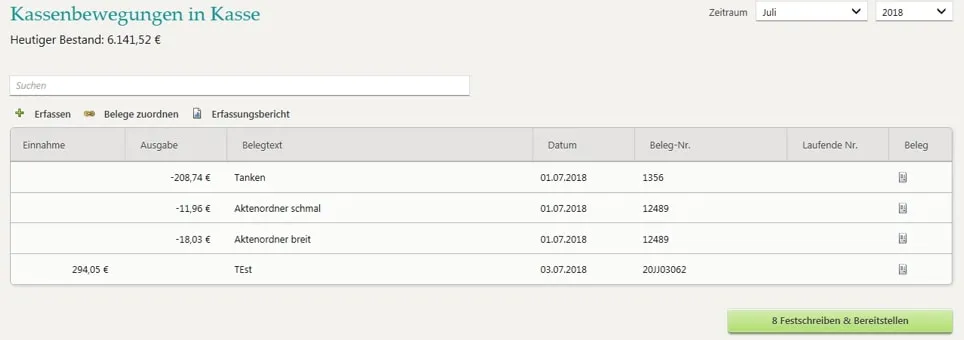Noch nicht festgeschriebene Kassenbewegungen können jederzeit geändert oder gelöscht werden. Erst durch das Klicken auf die Schaltfläche Festschreiben & Bereitstellen werden die Kassenbewegungen unveränderbar gesichert und gleichzeitig für die weitere Verarbeitung in den DATEV Rechnungswesen-Produkten bereitgestellt. Zu diesem Zeitpunkt wird auch die laufende Nummer vergeben.