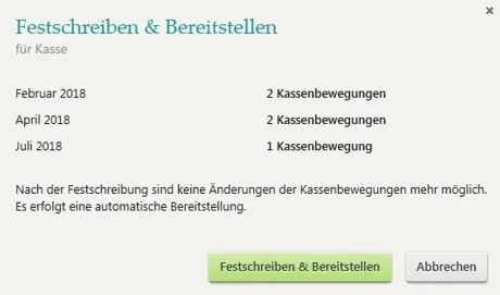 Noch nicht festgeschriebene Kassenbewegungen können jederzeit geändert oder gelöscht werden. Erst durch das Klicken auf die Schaltfläche Festschreiben & Bereitstellen werden die Kassenbewegungen unveränderbar gesichert und gleichzeitig für die weitere Verarbeitung in den DATEV Rechnungswesen-Produkten bereitgestellt. Zu diesem Zeitpunkt wird auch die laufende Nummer vergeben.