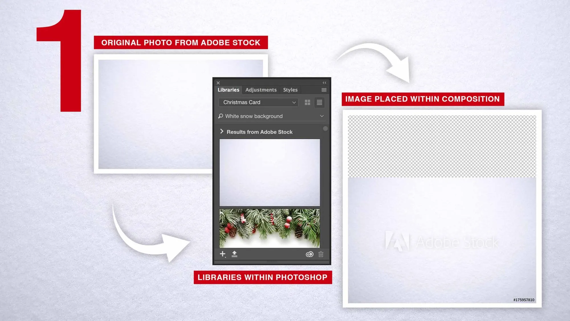 Beginne dein Projekt, indem du in Photoshop mit dem Bibliotheken-Werkzeug Adobe Stock durchsuchst. Halte Ausschau nach einem stimmungsvollen Hintergrund, der die festliche Jahreszeit widerspiegelt – verschneite Landschaften, Winterwälder oder andere weihnachtliche Motive eignen sich hervorragend.