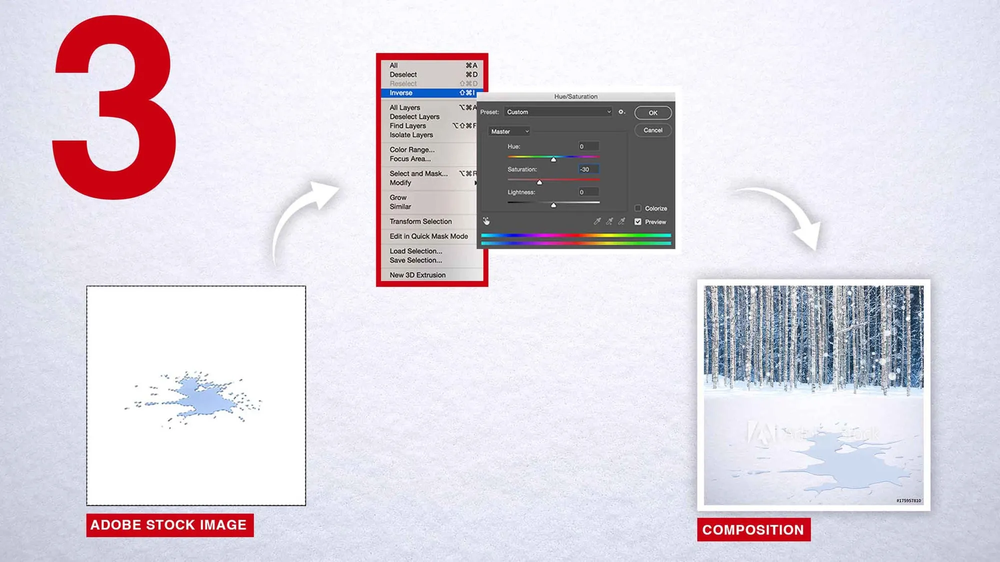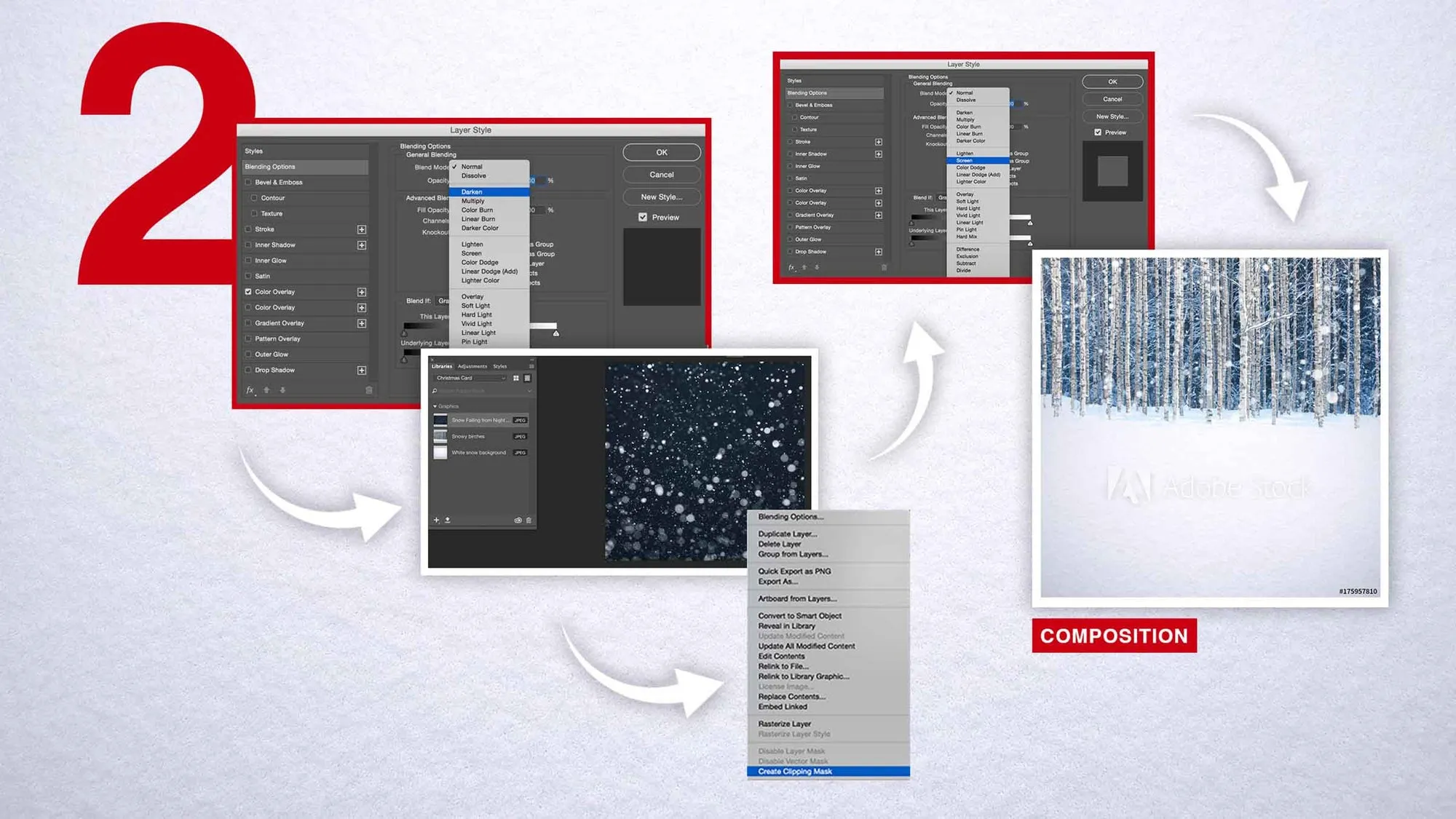 Als Nächstes suchst du in Adobe Stock nach dem Stichwort „verschneiter Wald“. Du findest eine Vielzahl von Optionen, aus denen du deinen Favoriten auswählst. Füge dieses Bild nahtlos deinem bestehenden Hintergrund hinzu. Verwende die Mischoptionen und stelle den Mischmodus auf „Abdunkeln“ ein, um den neuen Schnee übergangslos über der darunterliegenden Waldebene einzufügen. Mit dem Radiergummi-Werkzeug und einer niedrigen Härte kannst du eventuell störende Kanten sanft ausblenden.