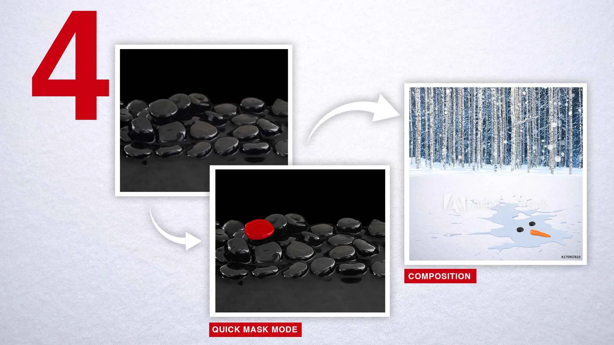 Sobald du in Adobe Stock einen Kieselstein gefunden hast, der sich gut für die Augen eines Schneemanns eignen würde, schneide ihn mit dem Modus „Schnellmaske“ aus. Stelle dabei die Härte des Pinselwerkzeugs auf einen hohen Wert ein und male über den Kieselstein. Wähle den Kieselstein erneut mit dem Maskierungsmodus aus und nutze anschließend das Ebenenmasken-Werkzeug, um den Rest des Bildes zu entfernen. Wiederhole diesen Schritt für eine Karotte, die als Schneemannnase dienen soll.