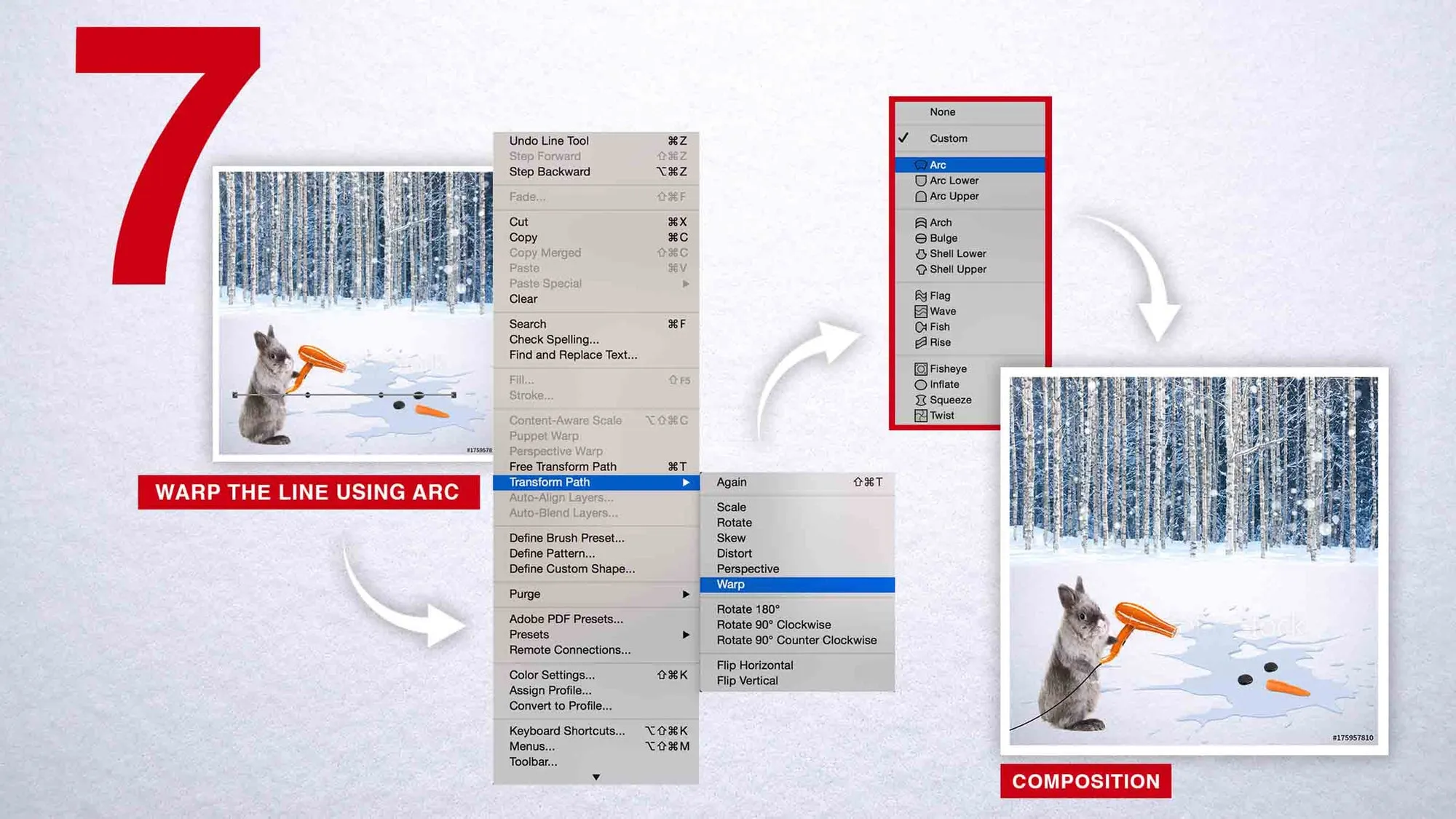 Um ein passendes Stromkabel für den Haartrockner hinzuzufügen, zeichne zunächst eine horizontale Linie mit einer Stärke von 3 px. Transformiere diese Linie anschließend mithilfe des Verkrümmen-Werkzeugs und wähle die Vorgabe „Kreisbogen“. Drehe die geformte Linie abschließend und füge sie präzise am Ende des bereits vorhandenen Föhnkabels ein. So wirkt es, als ob das Kabel ganz natürlich aus dem Gerät kommt und zum Boden führt – ein weiteres Detail, das deine Weihnachtskarte in InDesign professionell wirken lässt.