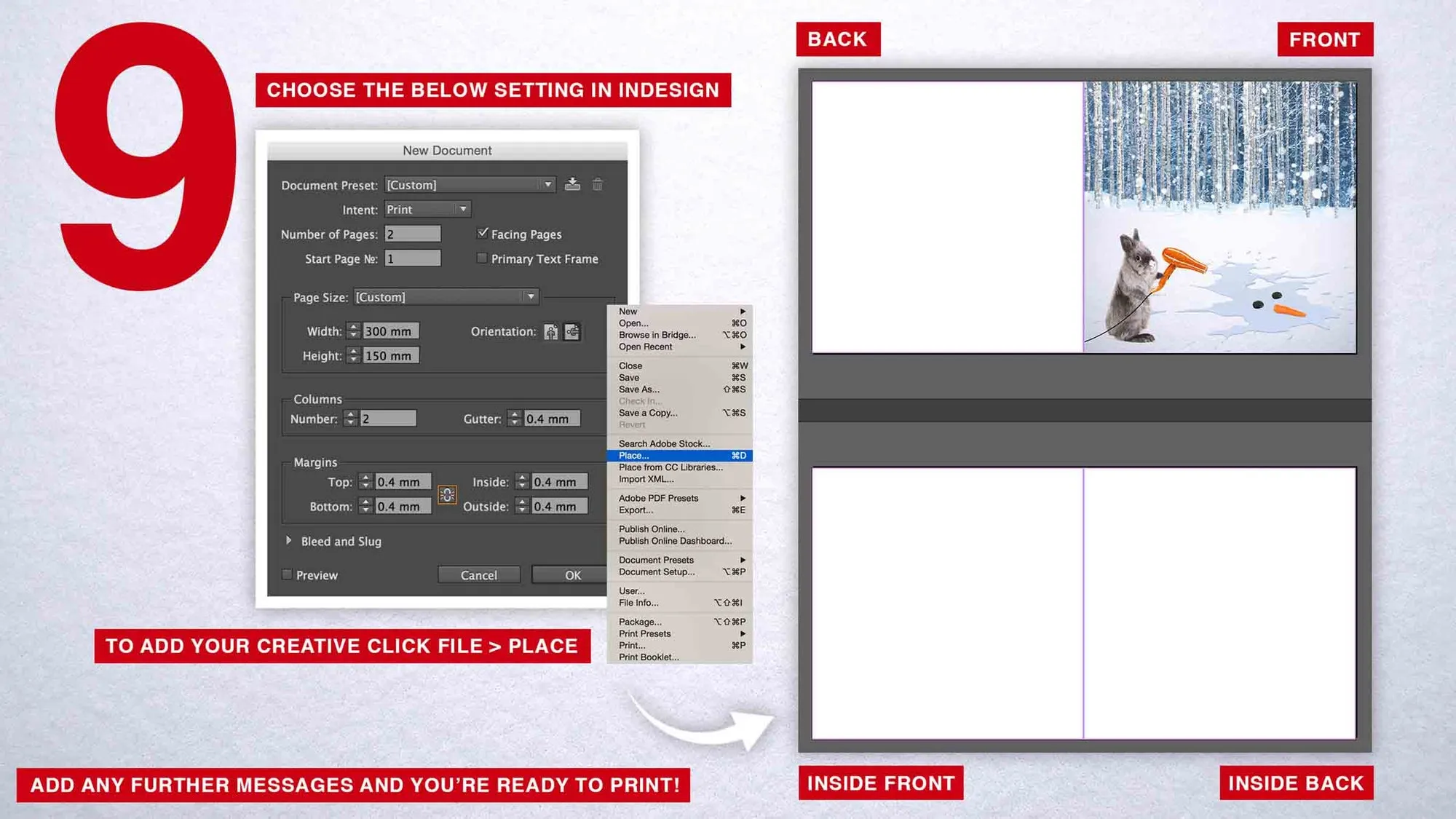 Klicke anschließend auf Datei > Platzieren und ziehe deine fertige PSD-Datei auf die Vorderseite deiner Karte im InDesign-Dokument. Dieser Schritt ist essenziell, um deine Weihnachtskarte in InDesign für den Druck vorzubereiten.