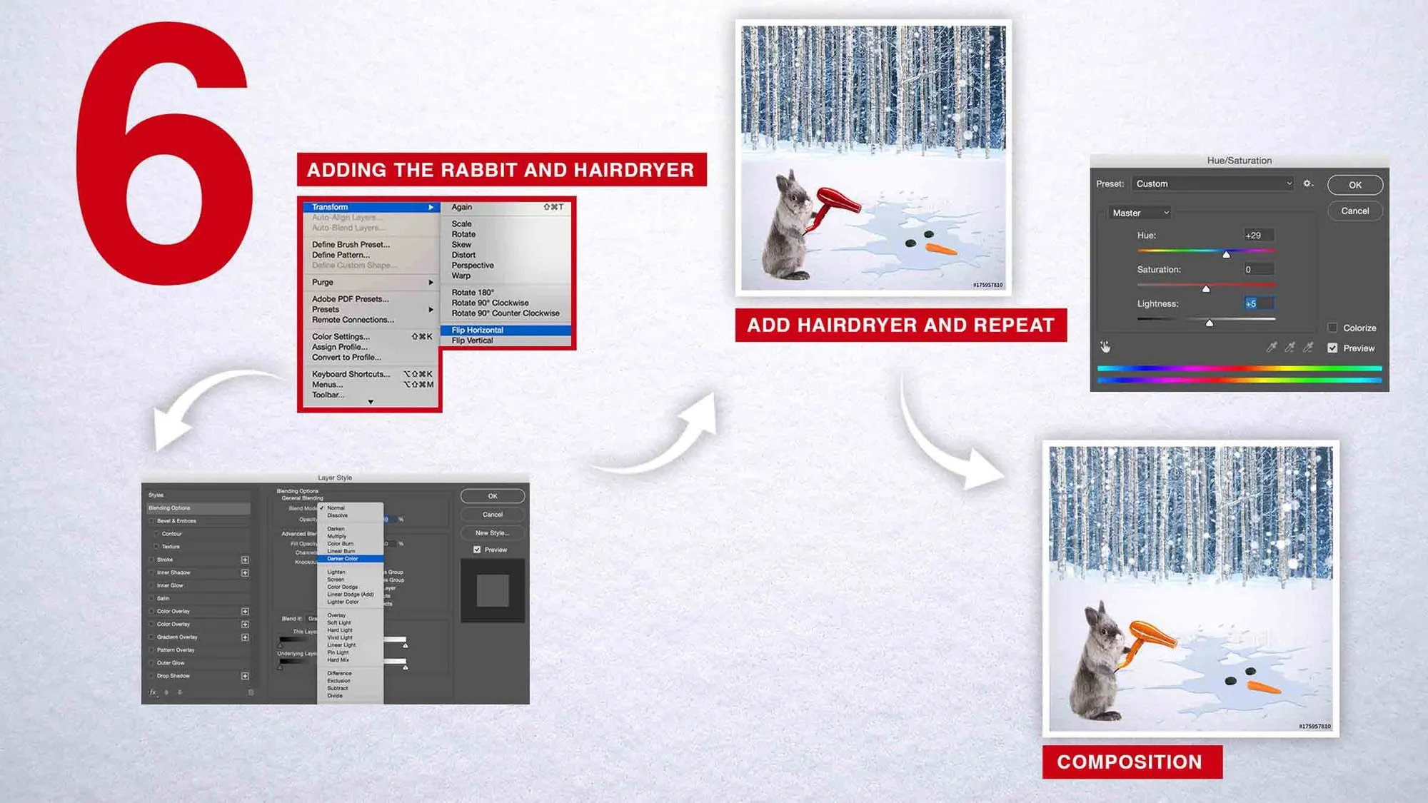Nachdem du dein Hasenbild und einen Haartrockner gefunden hast, füge diese deiner Komposition hinzu. Spiegele den Hasen horizontal mithilfe des Transformieren-Werkzeugs, um die Ausrichtung anzupassen.