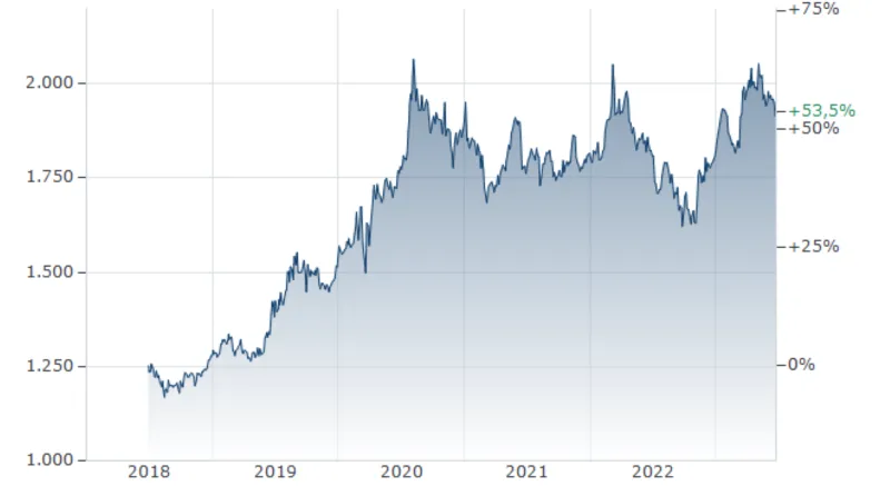 Ähnliche Beobachtungen lassen sich beim Silberpreis im Vergleich zum US-Dollar machen. Auch hier sind, ähnlich wie beim Goldpreis, Volatilität und ein genereller Aufwärtstrend erkennbar.