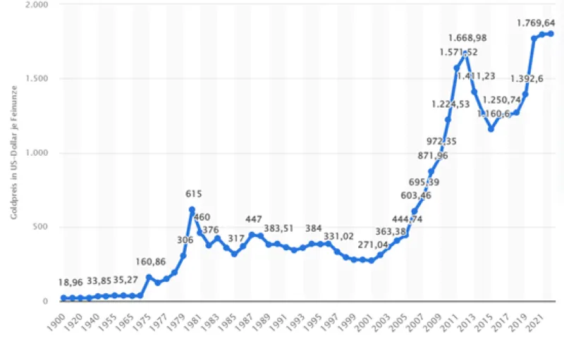 Quelle: https://de.statista.com/statistik/daten/studie/156959/umfrage/entwicklung-des-goldpreises-seit-1900/